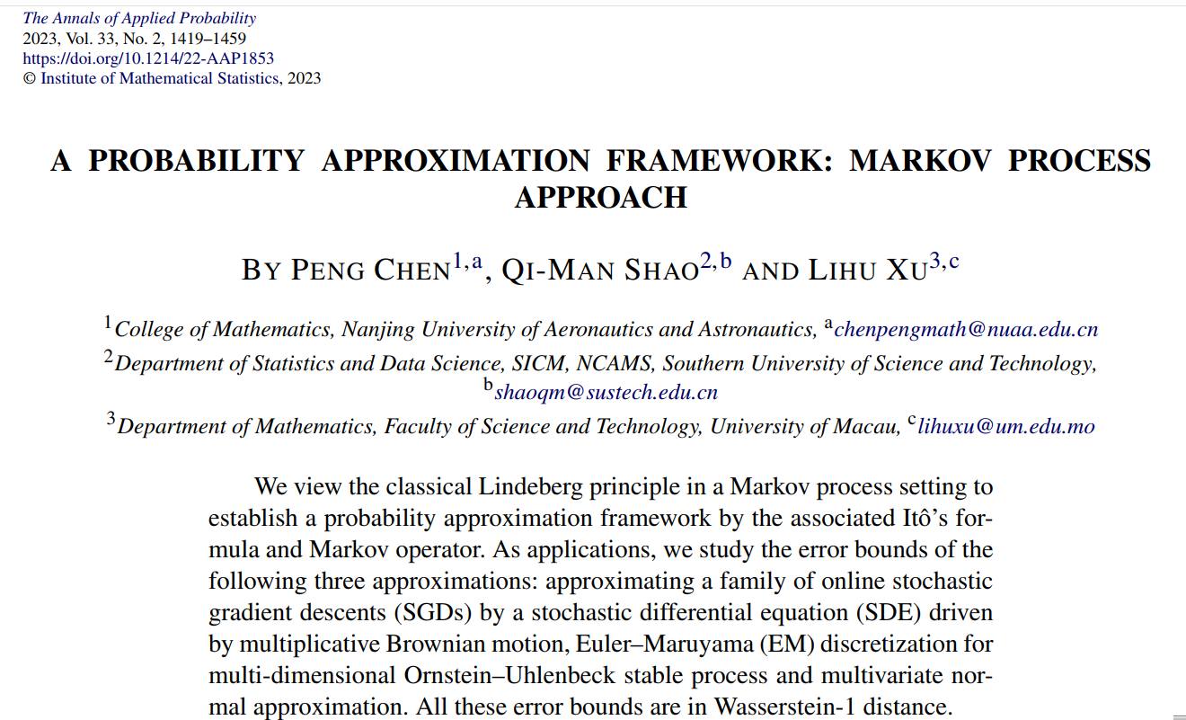 日前,伟德概率统计系教师陈鹏及其合作者在概率统计顶级期刊《The Annals of Applied Probability》上发表了题为“A Probability Approximation Framework: Markov Process Approach”的研究论文。