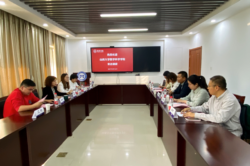 周佼佼首先向王斐一行表示热烈欢迎,接着详细介绍了学院的基本情况,重点介绍学生工作特色举措等。王斐介绍了本次来访的背景和目的,对数学学院的热情接待表示感谢,并就山西大学数学科学学院的发展历史、专业建设、学科建设以及人才培养等工作进行介绍。熊立婷介绍了山大数学学院“导师有约”及学生科创体系建设情况。戚月、刘思佳分别介绍了数学学院的共青团工作和学支等学风建设情况特色做法。随后,双方就基础学科人才培养、学科竞赛组织和升学就业等工作进行了交流和讨论。