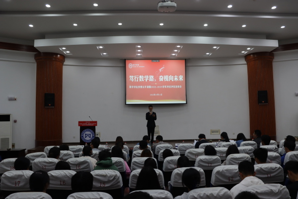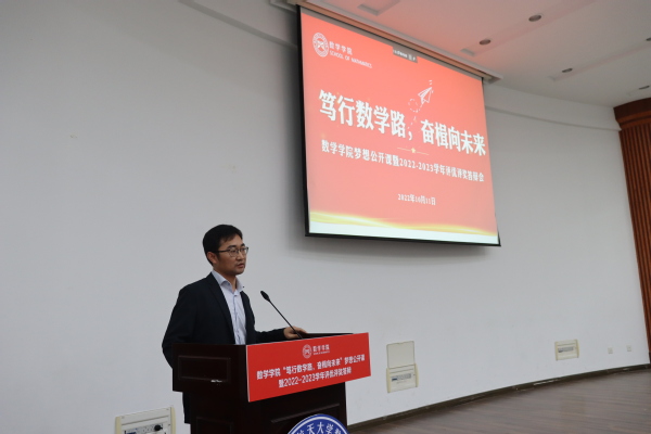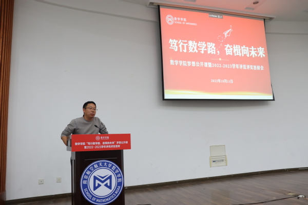 为了充分发挥榜样育人的作用,用身边的榜样激励更多的同学见贤思齐、矢志奋斗,10月11日下午,数学学院于理学楼报告厅举办“笃行数学路,奋楫向未来”梦想公开课暨2022-2023学年评优评奖答辩会。参加此次活动的评审有数学学院计算科学系主任龚荣芳,概率统计系主任、0823401班班主任蒋辉,概率统计系副教授陈晓红,0823102班班主任顾燕,团委书记戚月,2020级、2023级辅导员陈越及两名2023级学生代表。活动由学院2023级新生徐瑞霖主持,2023级全体本科生到场学习。