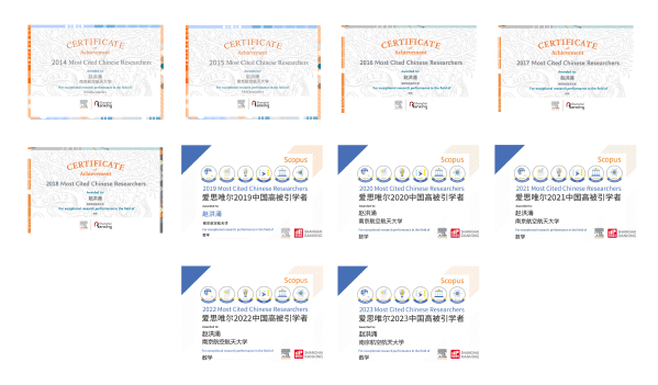 赵老师所指导的研究生中1人在博士期间顺利评上教授职称;指导学生获省、校优秀硕、博学位论文6篇;获国家自然科学基金资助4人次、全国博士后科学基金面上一等资助1项;获国家奖学金4人次、江苏省研究生学术创新论坛二等奖和三等奖2项、上海市研究生学术创新论坛一等奖1项、江苏省“优秀学生干部”、江苏省 “三好学生”荣誉称号2人次、“群星”创新奖和提名奖2项。研究生工作室连续三年被评为“五星研究生工作室”,团队连续四次获评“优秀研究生创新团队”荣誉称号。团队获批南京航空航天大学2021年度研究生“‘五好’导学团队”。2022、2023年度“‘五好’导学团队”星级评定连续获评优秀。