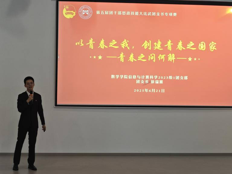作为数学学院本科生基层团支部书记,徐瑞霖同学历经学院初赛、校级选拔赛至省级总决赛的层层选拔,一路稳扎稳打、突破进阶。校赛阶段,他以青年人的“青春之问”为核心主题,深入阐述不同时代浪潮下青年的使命担当,凭借深刻的思考与生动的表达斩获校赛一等奖。